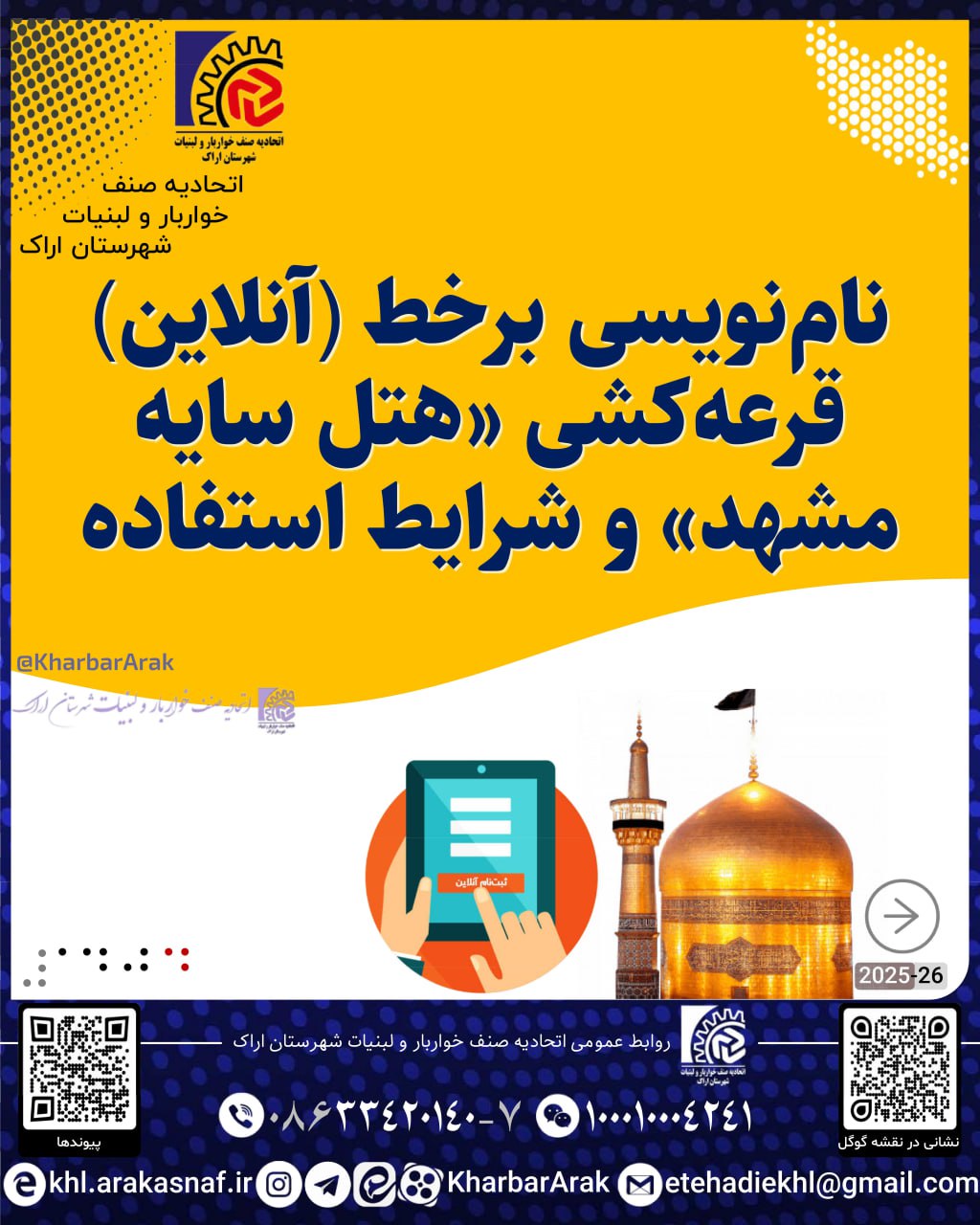 پيرو آگهي پيشين درباره نامنويسي از همکاران مشتاق جهت اسکان در هتل مورد قرارداد با اتحاديه در شهر مشهد مقدس؛ هتل سايه»، به اطلاع ميرساند، نام نويسي به صورت برخط (آنلاين) و از طريق نشاني مندرج زير اين اطلاعيه يا در بخش ثبت نام هتل سايه مشهد» سربرگ خدمات سايت» تارنماي اتحاديه انجام ميشود:
