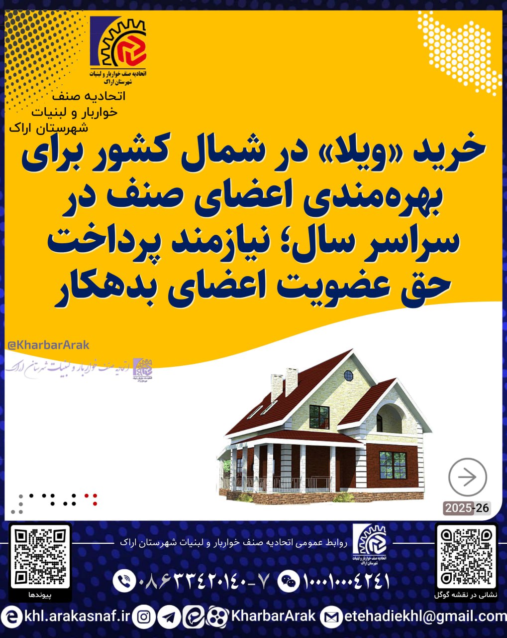 به آگاهي مي رساند با پيشنهاد رئيس اتحاديه؛ آقاي احسان اميني، و پذيرش هيئت مديره اتحاديه صنف، پس از برآورد و بررسي هاي انجام شده مقرر شد تا براي خريد يک واحد ويلا» در يکي از شهرهاي شمالي کشور با موقعيت جغرافيايي شايسته، براي بهره مندي اعضاي صنف در همه زمان هاي سال اقدام گردد که البته اين موضوع بستگي بسياري به دريافت مطالبات دارد. اجرايي شدن اين موضوع نيازمند پرداخت حق عضويت اعضاي بدهکار در کمترين زمان ممکن است که از اين روي از همه همکاران بدهکار درخواست مي شود تا با پرداخت حق عضويت خود حداکثر تا 1404/09/12 در عملياتي شدن اين پيشنهاد سهيم باشند. روشن است که اجرايي شدن پيشنهاد کنوني نيازمند همکاري به هنگام اعضاي بدهکار صنف و تأمين مالي به موقع است.